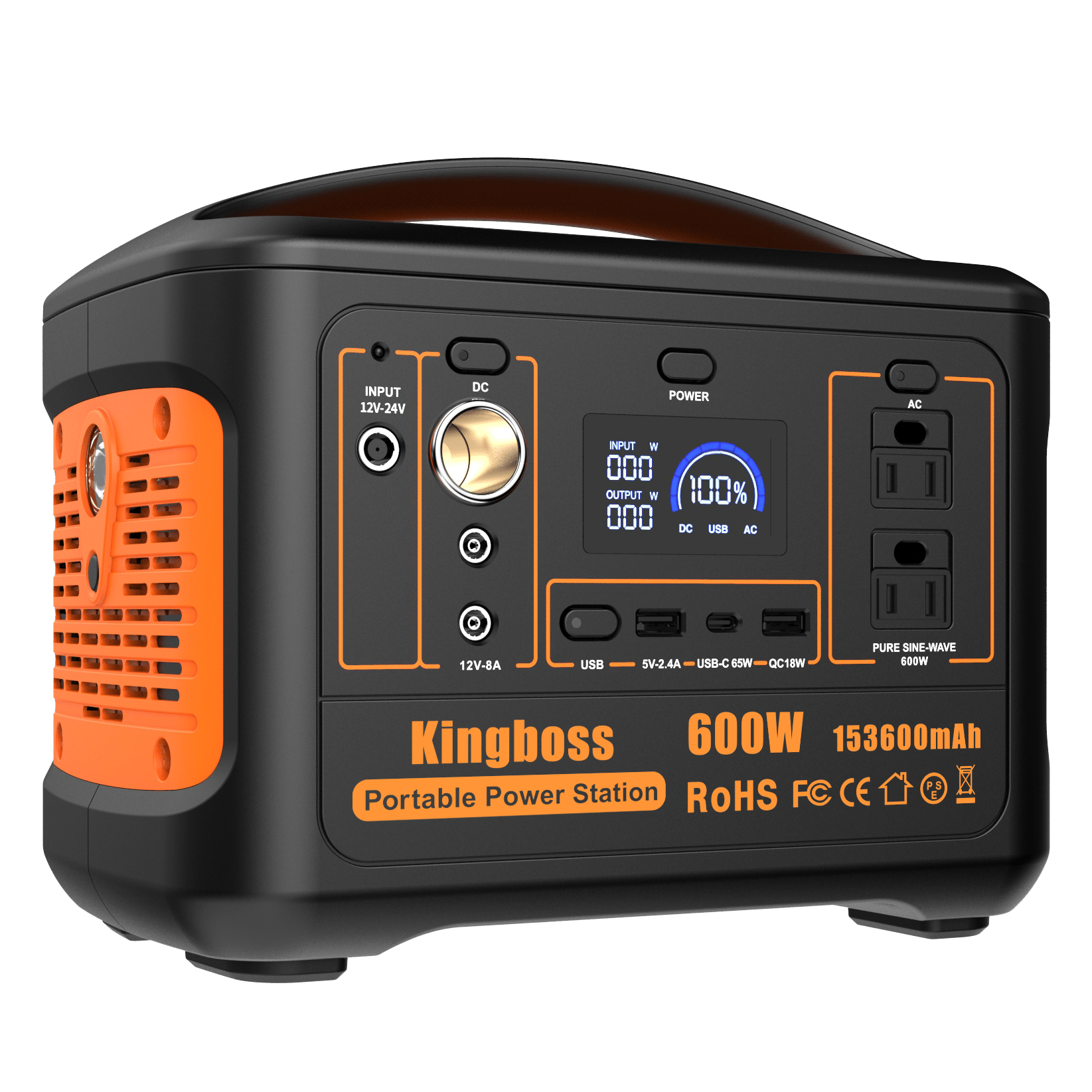 [MULTIPLE OUTPUT PORTS]: Kingboss Portable Power Station is featured with AC/DC/USB outputs: 2*110V AC output (600W); QC 3.0 USB port; 1*USB port (5V-2.4A); 1*USB-C PD65W; 1*DC input with 1*DC input (12V- 24V).[DEVICES]: Our Portable Power Station can charge devices such as: Computer; Jump Starter; Mini Projector; Fan; Mini Fridge; Printer; Drone; Phones/Tablet; Powertool; Laptop/TV. Only Devices up to 600W can be charged.[INCLUDES]: Kingboss Electric Generator includes 600W outdoor and indoor power supply; Car charger; AC power adapter; USB-C Cable + Kingboss Travel Carrying Case. Our 600W Power Station is perfect to be transported due to its weight (11Ibs) and size (7.70x5.20x9.10in).[RECHARGING METHODS]: Our Battery Powered Outlet can be recharged: With a compatible 100W solar photovoltaic panel (8 hours); With our car charger (12 hours); With AC Wall Outlet (6.5 hours). Lithium Battery 1000W recharges faster than other batteries.[PROTECTION]: Kingboss Battery Generator is equipped with an advanced BMS (Battery Management System) Multiple Outlet that protects the battery and devices against short circuits; over-temperature; overcharging; overvoltage and overpowering.[SAFETY]: Our power bank includes a Pure Sine Wave AC output that ensures stable and safer charging; and reduces audible and electrical noise. On top of that; it contains an MPPT controller built-in for optimized high-efficiency solar charging.[RELIABLE]: To give customers a pleasant experience; Kingboss offers a 2 Year Warranty that allows you to return the portable generator by 7 days in case it is defective; and a 24/7 customer service. Camping outdoor awaits you with our Solar Generator!